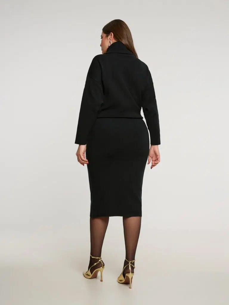 La jupe droite en maille intemporelle est disponible en deux tailles : S/M et L/XL. Cela permet de s’adapter à différentes morphologies.