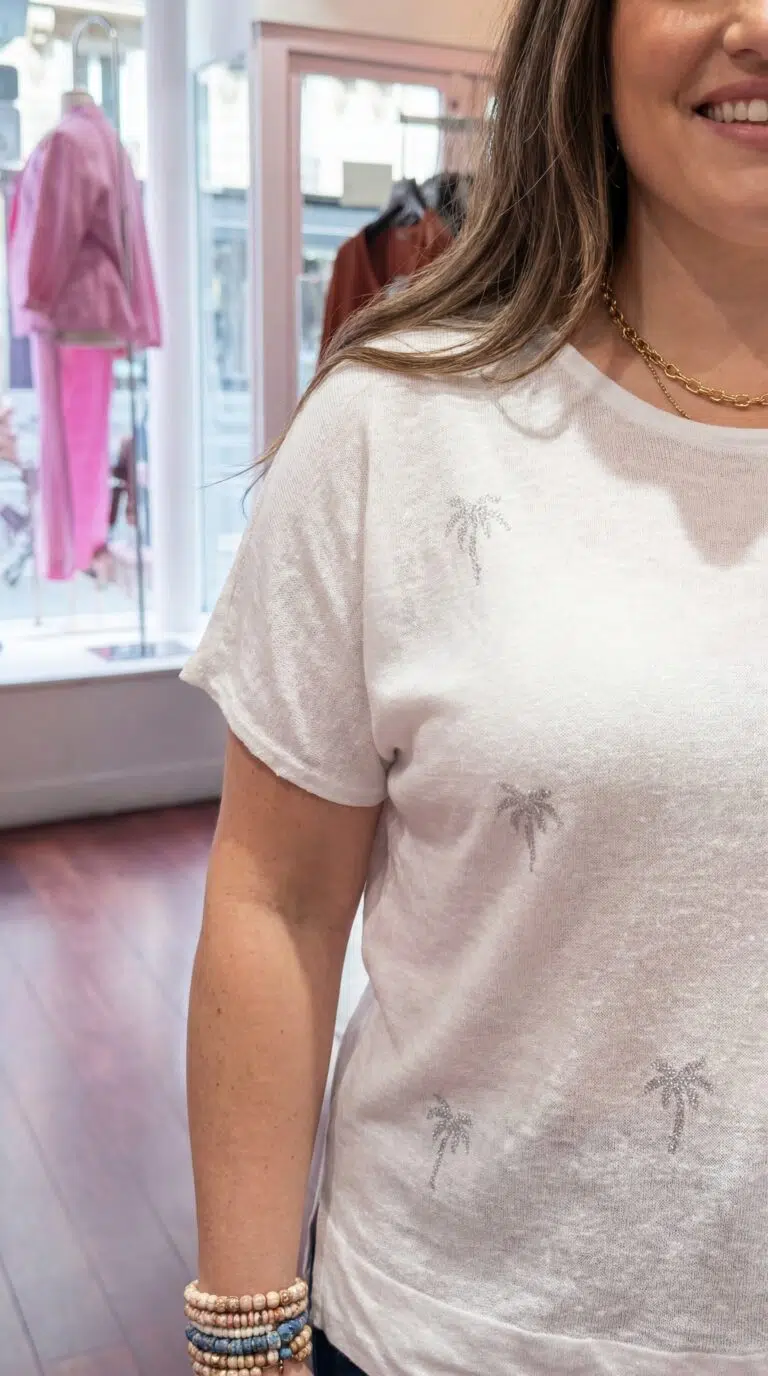 Les détails de ce pull ne passent pas inaperçus. Les palmiers en strass ajoutent une note de fantaisie et de féminité, rendant ce vêtement unique. Que ce soit pour une sortie décontractée ou une occasion spéciale, ce pull saura rehausser votre style.