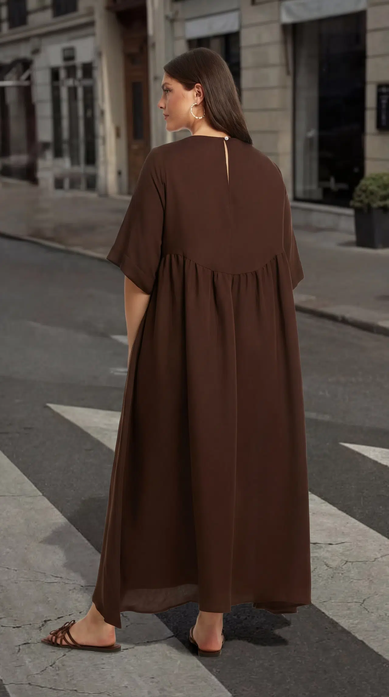 Pour préserver la qualité de votre robe, il est conseillé de la laver à la main ou en cycle délicat. Évitez le sèche-linge pour maintenir sa fluidité et sa texture douce. N'hésitez pas à explorer notre Collection pour compléter votre garde-robe avec d'autres pièces qui s'harmonisent parfaitement avec cette robe.