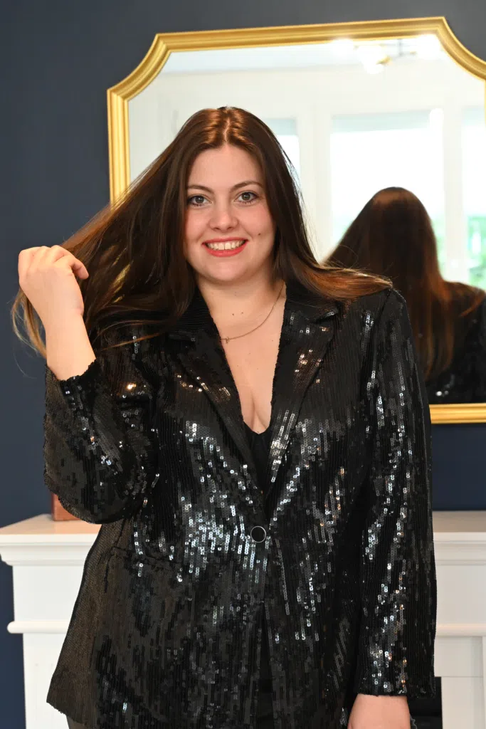 Cette veste à paillettes est le choix parfait pour celles qui souhaitent ajouter une touche de brillance à leur garde-robe. Conçue pour les femmes modernes, elle se marie à merveille avec un jean pour un look à la fois décontracté et sophistiqué.
